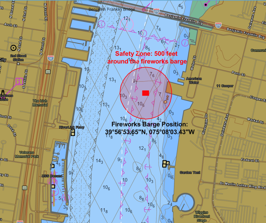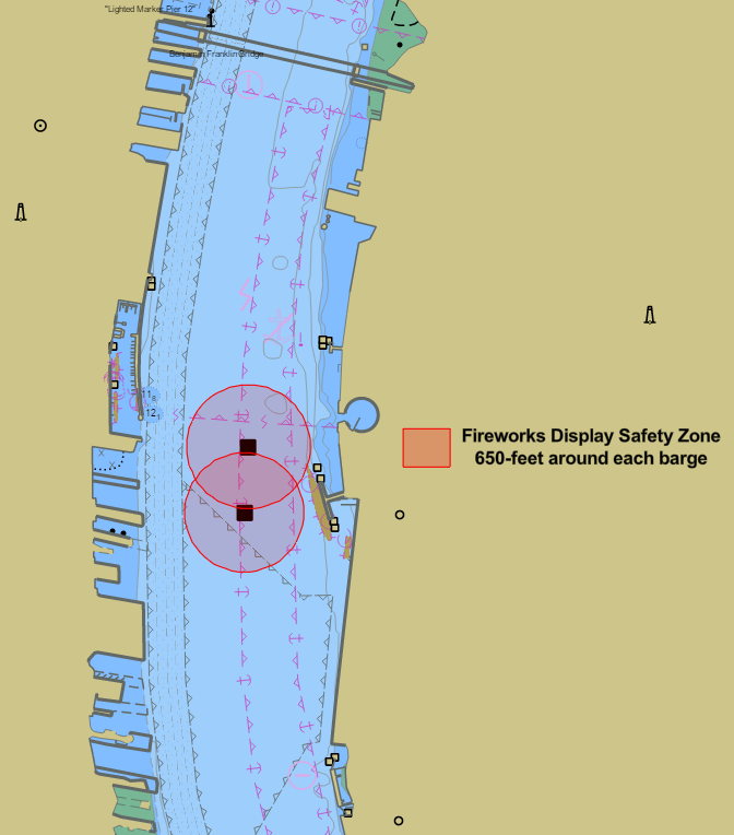 The USCG will establish a safety zone within the Delaware River North of the Ben Franklin Bridge in the vicinity of the Sugarhouse Casino on May 26th from 9:30 p.m. until 10:30 p.m. The Sugarhouse Casino will be sponsoring a Memorial Day fireworks event that evening. Mariners are advised to adjust transit times accordingly and use caution when transiting the area.