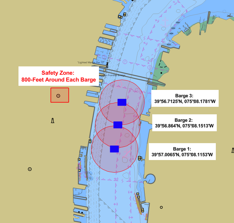 Mariners are cautioned that a combination of floating and submerged pipeline will be used. The dredge ESSEX will be standing by on channels 13 and 16 VHF-FM or can be contacted via cell phone at 757-353-0455. Traffic should contact the dredge 30 minutes prior to expected time of passage. Dredge operations are expected to continue 24 hours per day, until the completion of the project. Mariners are urged to use caution when transiting through the affected area and to stay clear of the dredge, booster, barges, derricks and operating wires about the dredge. Questions about the dredging or resulting anchorage closure should be directed to the Waterways Management Department by calling (215) 271-4889 or (215) 271-4851.