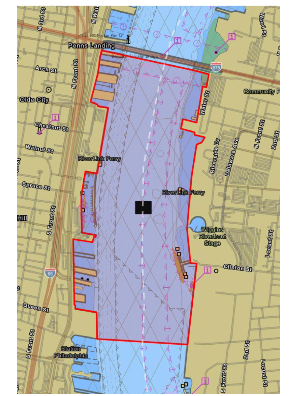 Please be advised there is a crane barge spudded down in Philadelphia Harbor, directly across from Penn’s Landing. The barge will be at this location 24 hours a day through Monday afternoon in preparation for the Navy demonstrations this weekend. All mariners are requested to stay a safe distance away from the barge, and also maintain no wake when transiting past this location. There are navigation lights on the barge.